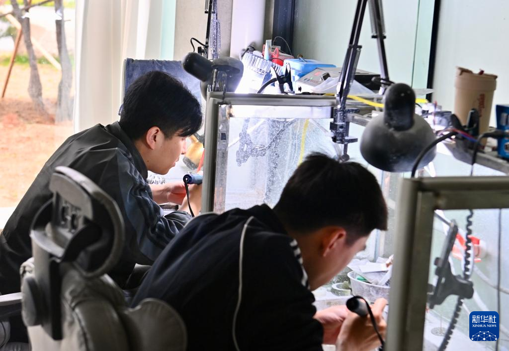5月20日,唐校(左)和父亲唐帅在“玉三生”工作室内切磋岫玉雕刻技艺。