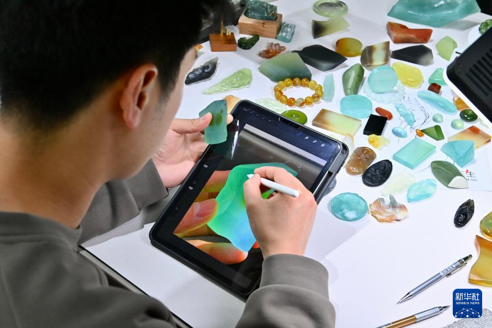5月20日,雕刻师在“玉三生”工作室内绘制岫玉加工图稿。
