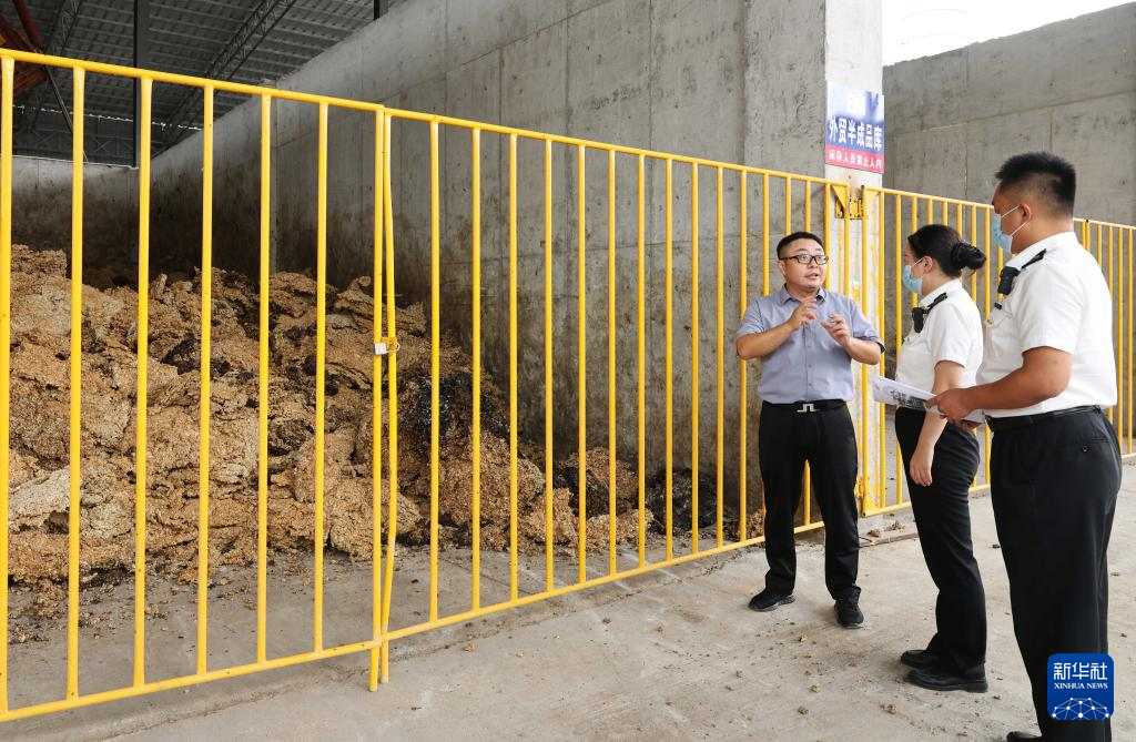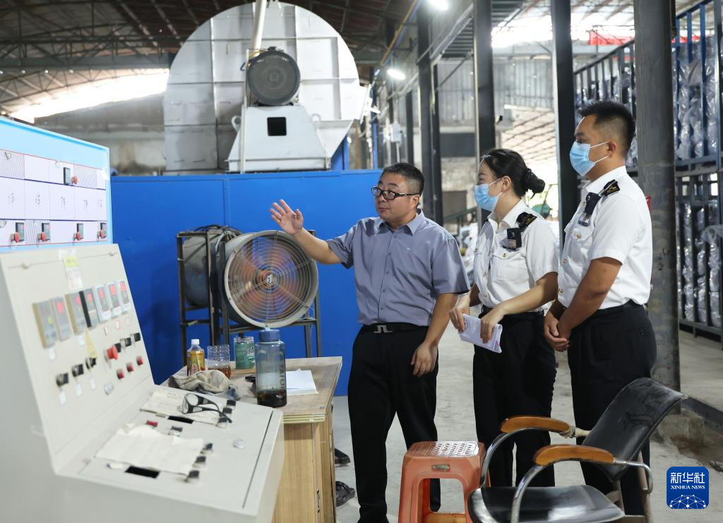 在海南乐东黎族自治县的海南象元实业有限公司,海口海关所属三亚海关关员(右一右二)了解企业生产情况(5月28日摄)。