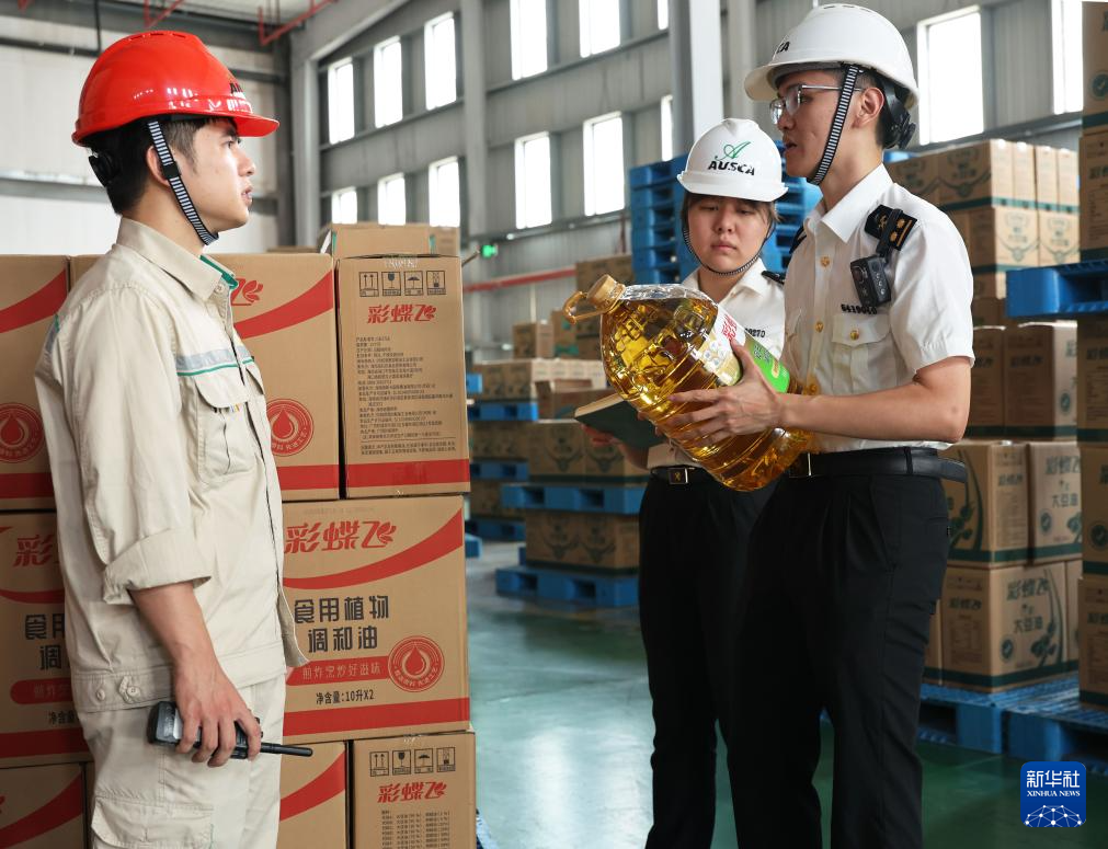 在位于海南洋浦经济开发区保税港区的澳斯卡国际粮油有限公司,洋浦海关关员(右一右二)在成品仓库了解企业生产情况。该公司是海南首批加工增值免关税试点企业(5月27日摄)。