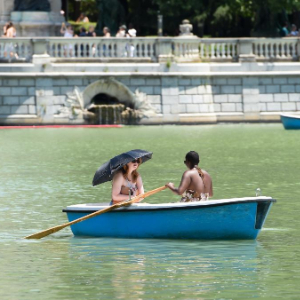 5月29日,人们在西班牙首都马德里的一处公园内划船。