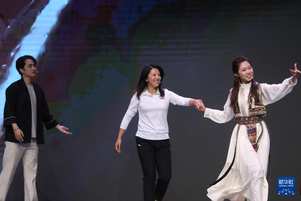 5月30日,在第四届文明交流互鉴对话会开幕式上,冬奥冠军杨扬(中)与嘉宾一起进行《“三兔共耳”话文明 青年同心向未来》主题展示。