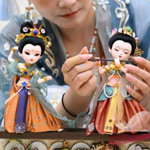 5月30日,一名古装女子在第四届文明交流互鉴对话会的开幕式后整理敦煌文化主题展品。