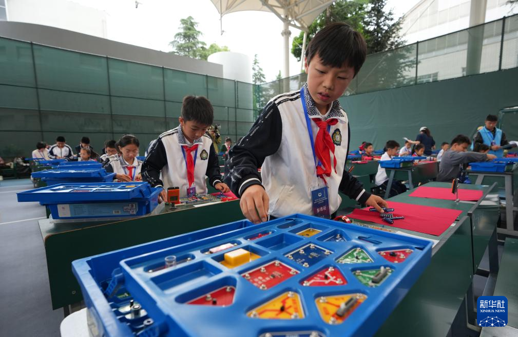 5月31日,参赛选手在全国青少年科技教育成果展示大赛云南省区域赛上进行智能电路与工程比赛。