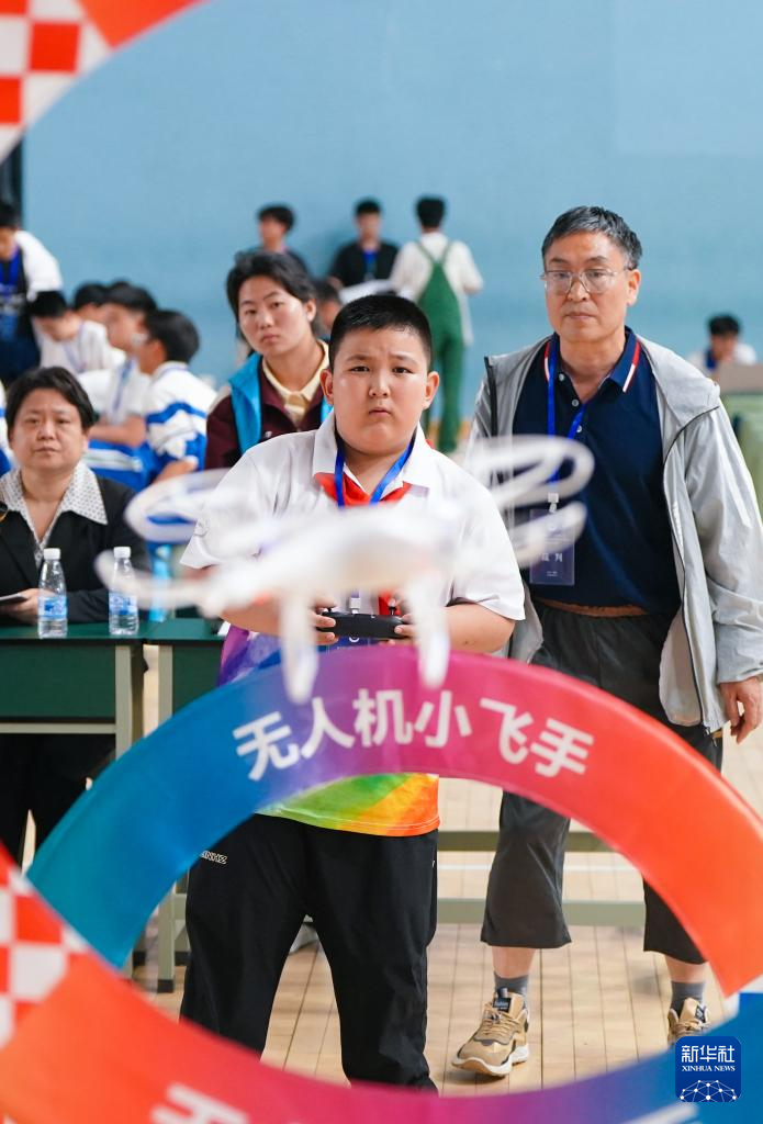 5月31日,一名参赛选手在全国青少年科技教育成果展示大赛云南省区域赛上操作无人机进行比赛。