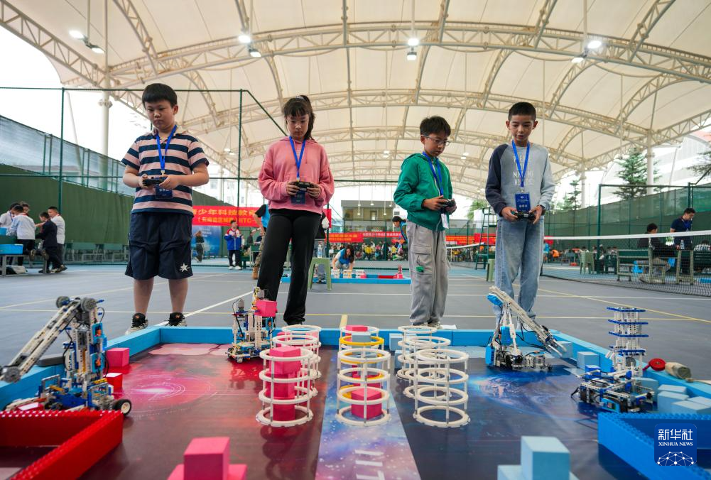 5月31日,四名参赛选手在全国青少年科技教育成果展示大赛云南省区域赛上操作机器人进行比赛。