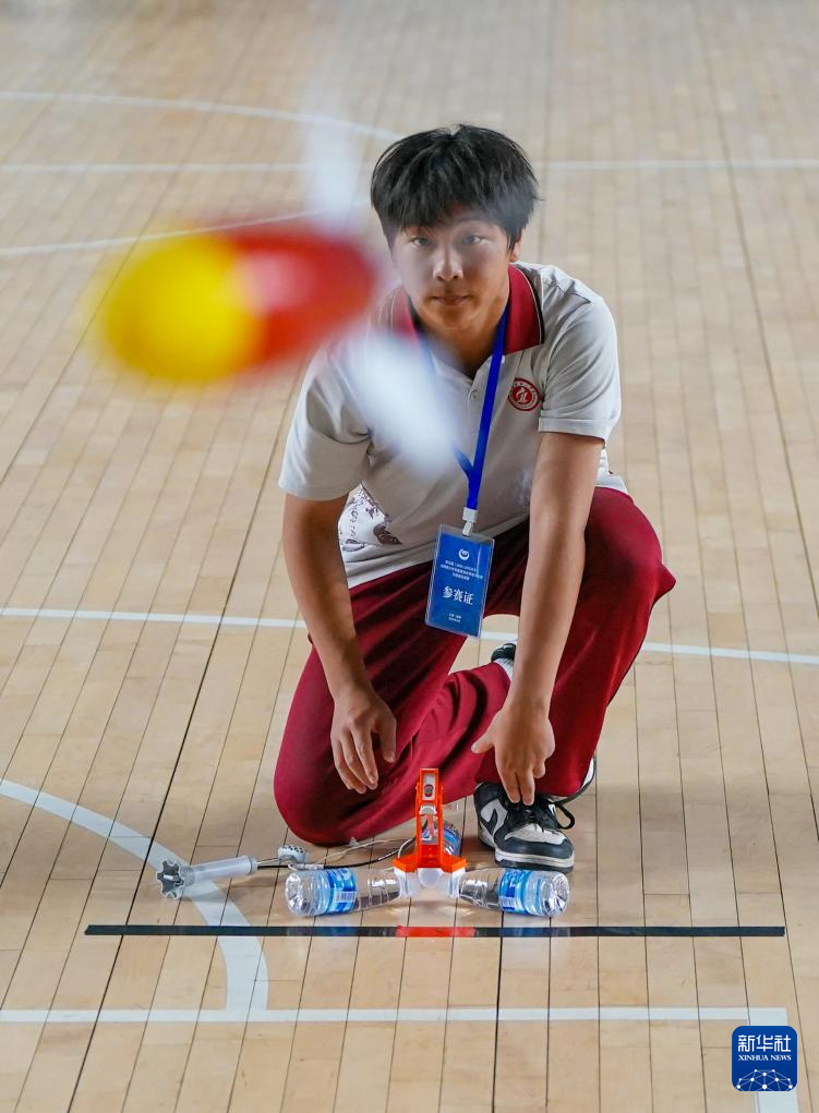 5月31日,一名参赛选手在全国青少年科技教育成果展示大赛云南省区域赛上发射“火箭”进行比赛。