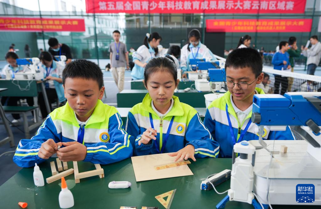 5月31日,参赛选手在全国青少年科技教育成果展示大赛云南省区域赛上制作木质模型。