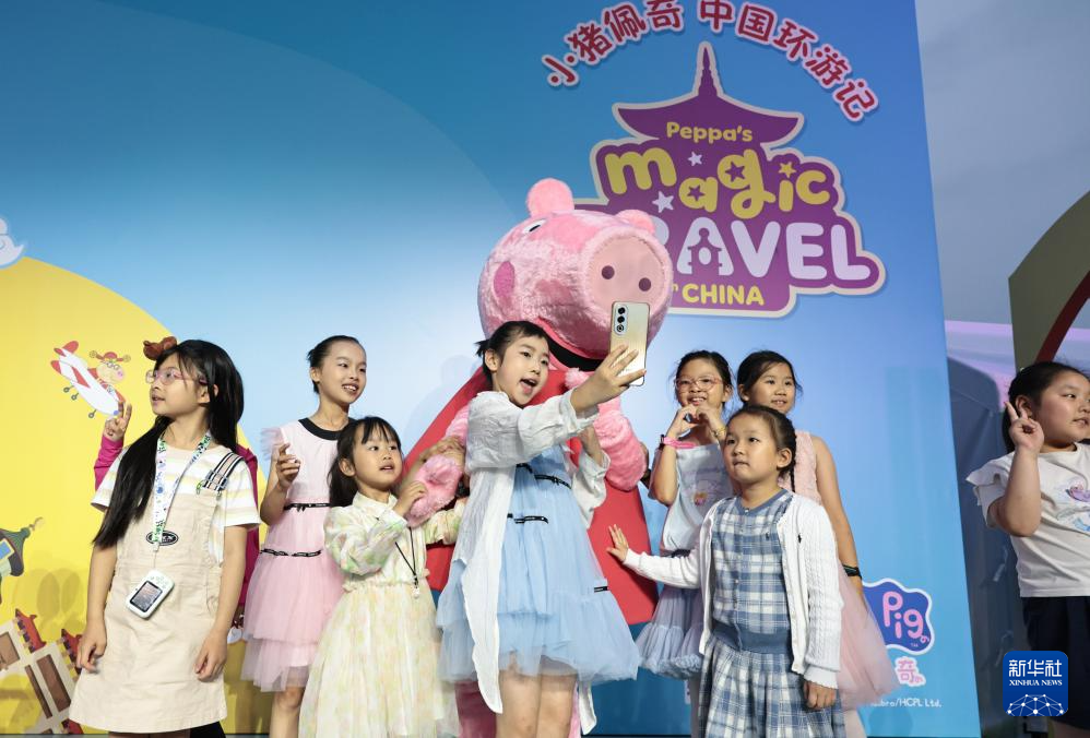 5月31日,小朋友们与工作人员装扮的佩奇玩偶互动合影。