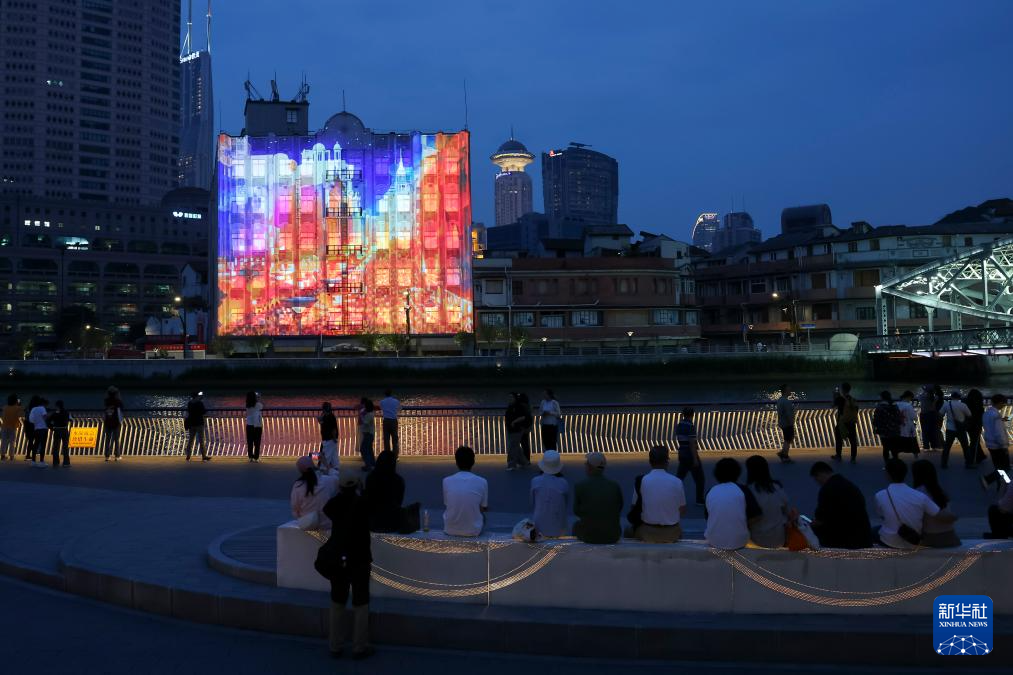 5月31日,人们在上海市静安区苏河湾亲水平台欣赏光影秀。