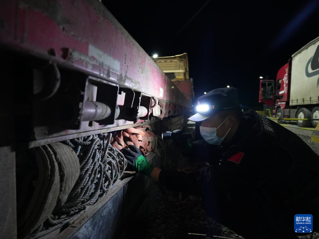 6月2日凌晨,在新疆伊尔克什坦口岸,边检站执勤民警对入境车辆进行车体检查。
