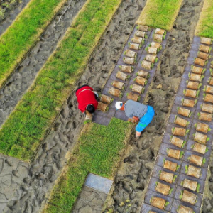 6月2日,山东省青岛市即墨区蓝村街道青香水稻种植合作社的农民在搬运秧苗(无人机照片)。