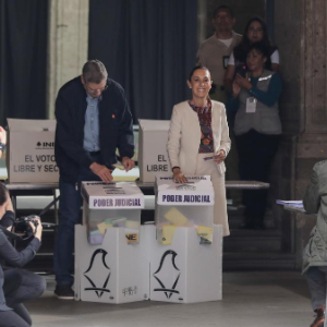 6月1日,在墨西哥首都墨西哥城,总统辛鲍姆(左二)参加司法机构选举投票。