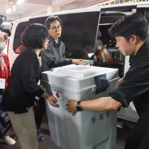 6月3日晚,工作人员在韩国首尔一处计票站运送选票。