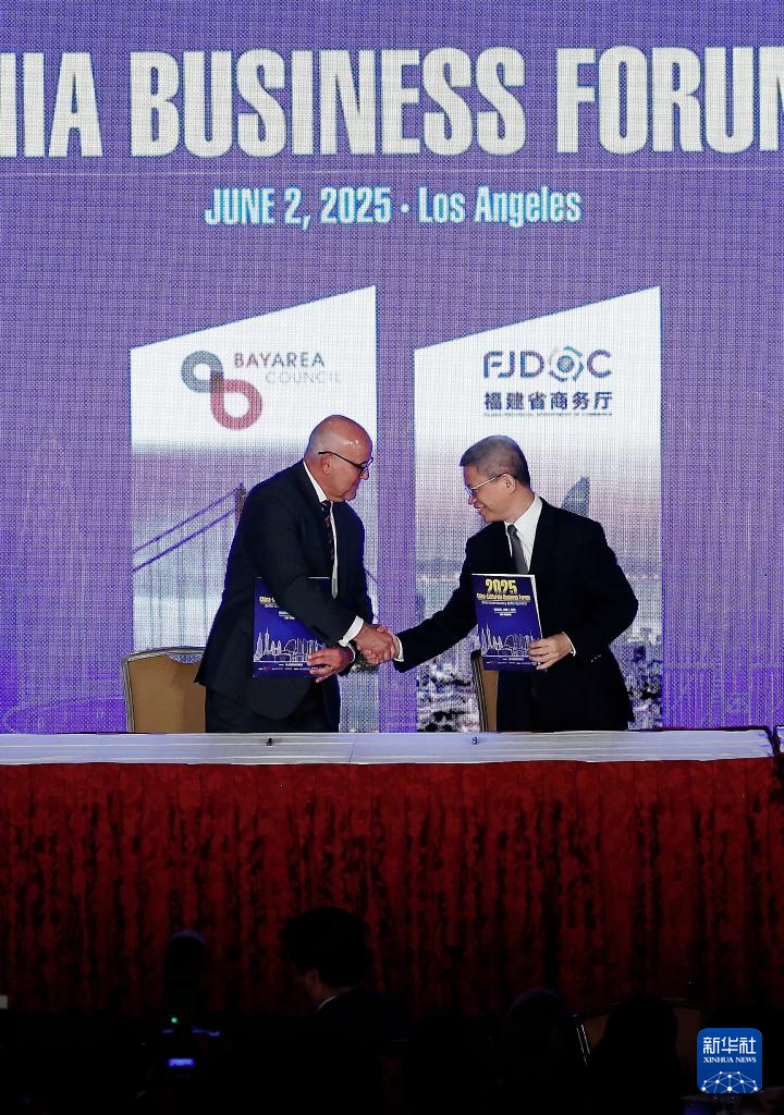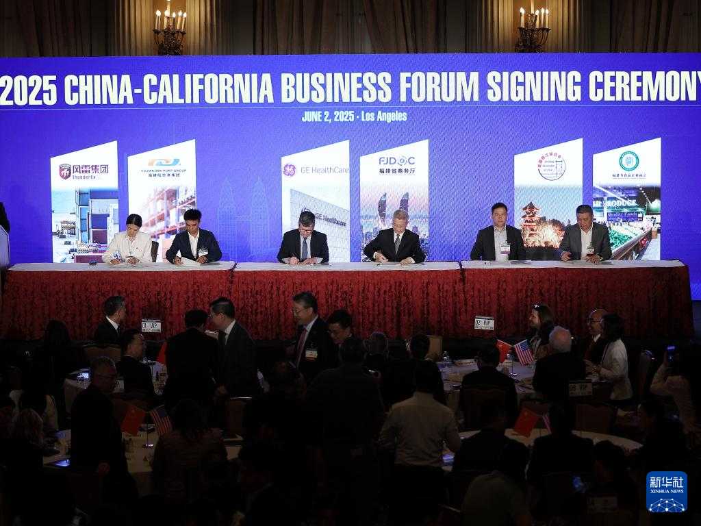 这是6月2日在美国洛杉矶举行的2025年中国—加州经贸论坛上拍摄的签约仪式。