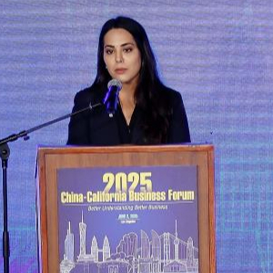 6月2日,美国加州交通署署长托克斯·奥米沙金在洛杉矶举行的2025年中国—加州经贸论坛上发言。