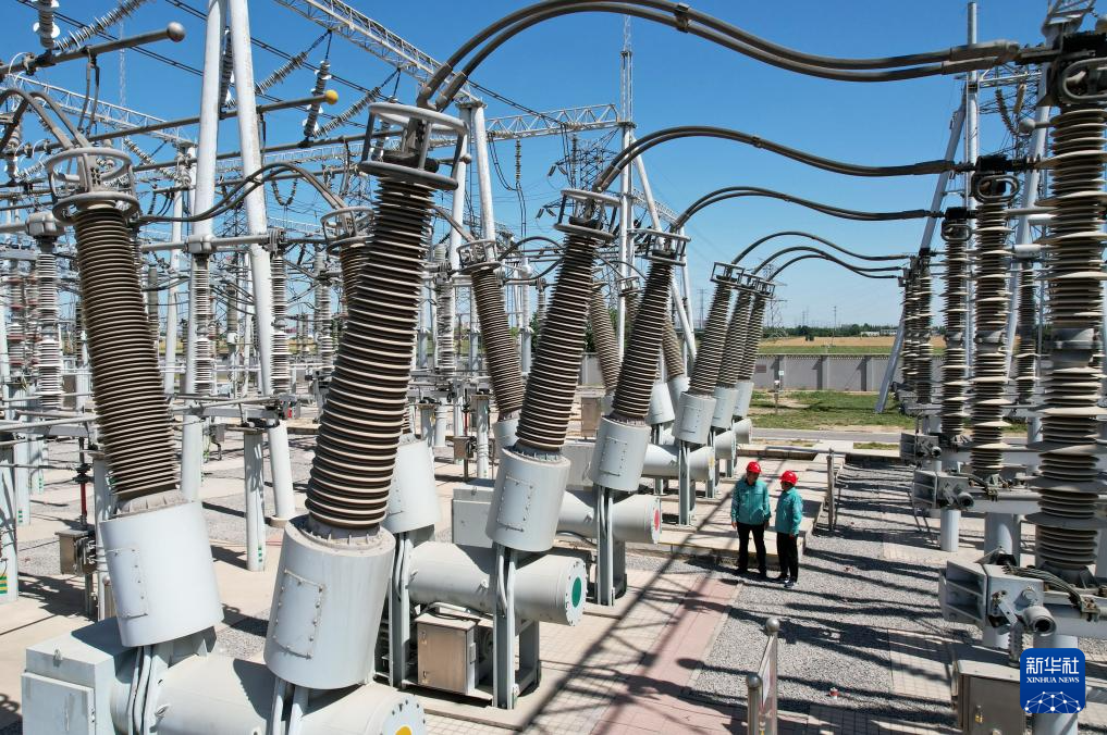 6月4日,国网河北省电力有限公司的工人在廉州500千伏超高压变电站内巡检(无人机照片)。
