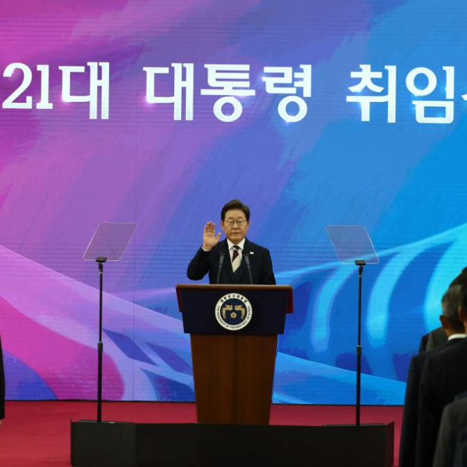 6月4日,在韩国首尔,李在明在韩国国会发表就职讲话。