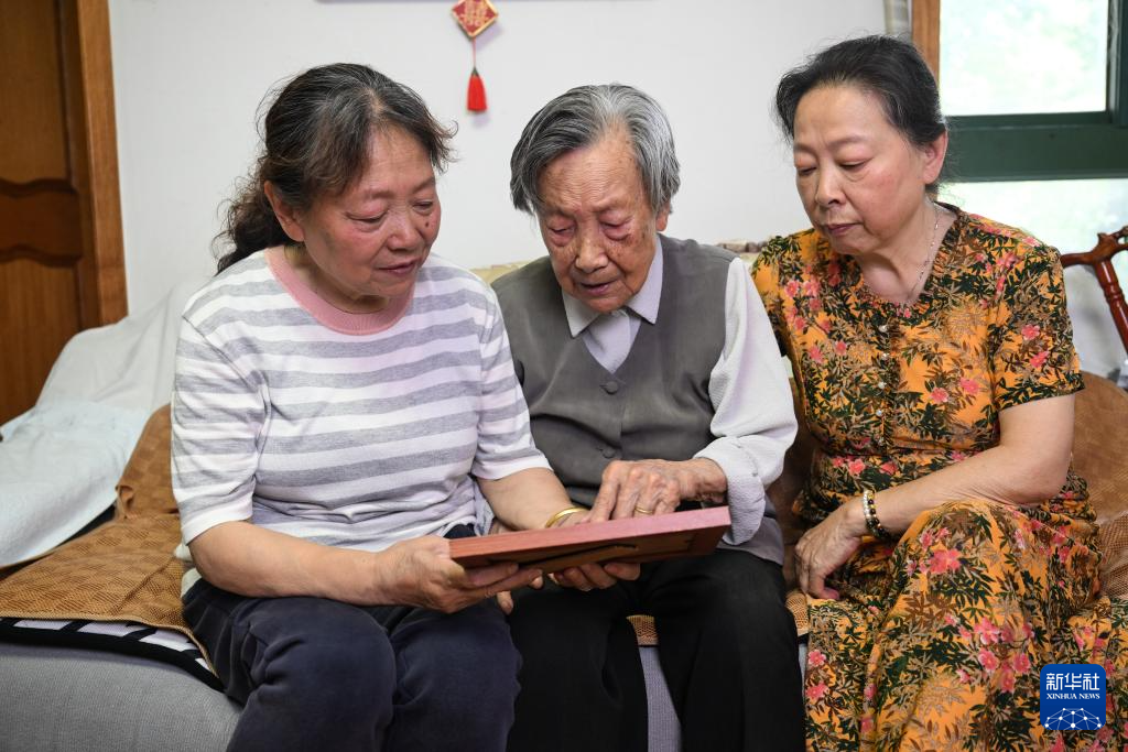 2025年5月21日,夏淑琴(中)在南京家中和女儿张雪萍(左)、张学霞一起看老照片。新华社记者 季春鹏 摄pagebreak