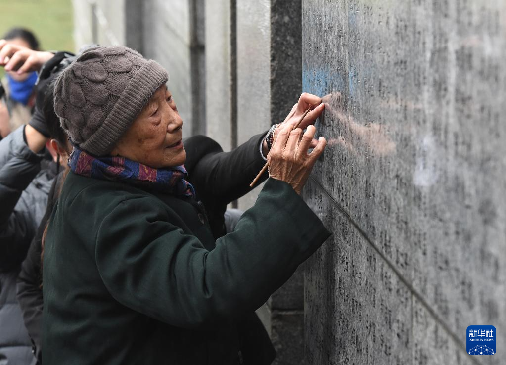 2018年12月10日,在侵华日军南京大屠杀遇难同胞纪念馆举行的死难者遗属家祭活动中,夏淑琴给遇难者名单墙上亲人的名字添漆。新华社记者 孙参 摄pagebreak