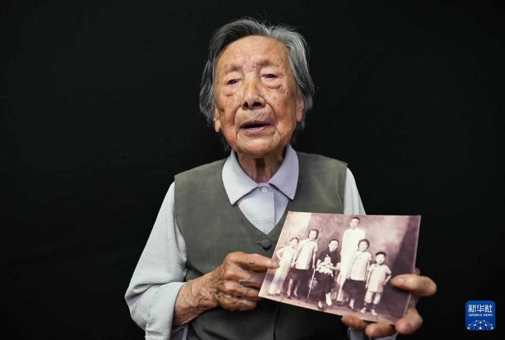 2025年5月21日,夏淑琴拿着1945年她和妹妹、舅舅一家的合影讲述当年的经历。新华社记者 季春鹏 摄pagebreak