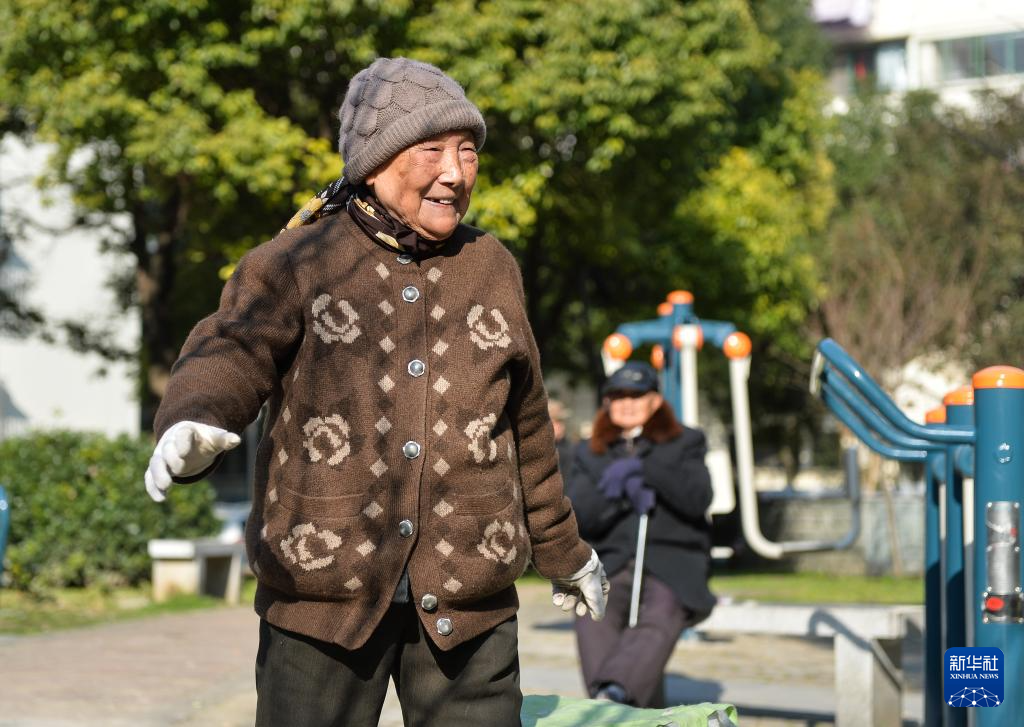 2017年1月14日,夏淑琴在南京小区院子里锻炼身体。新华社记者 季春鹏 摄pagebreak
