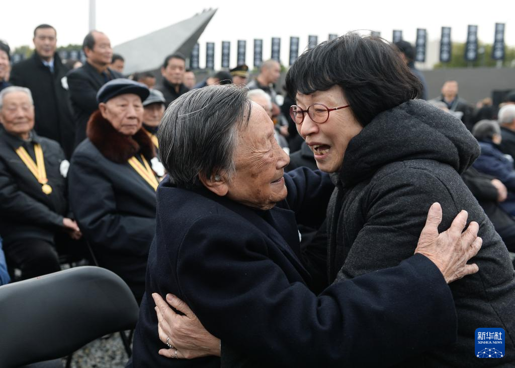 2017年12月13日,南京大屠杀死难者国家公祭仪式开始前,夏淑琴与日本友人松冈环(右)拥抱交流。新华社记者 季春鹏 摄pagebreak