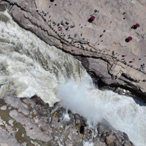 6月4日,游客在位于黄河壶口瀑布景区(山西临汾吉县侧)“龙洞”参观(无人机照片)。