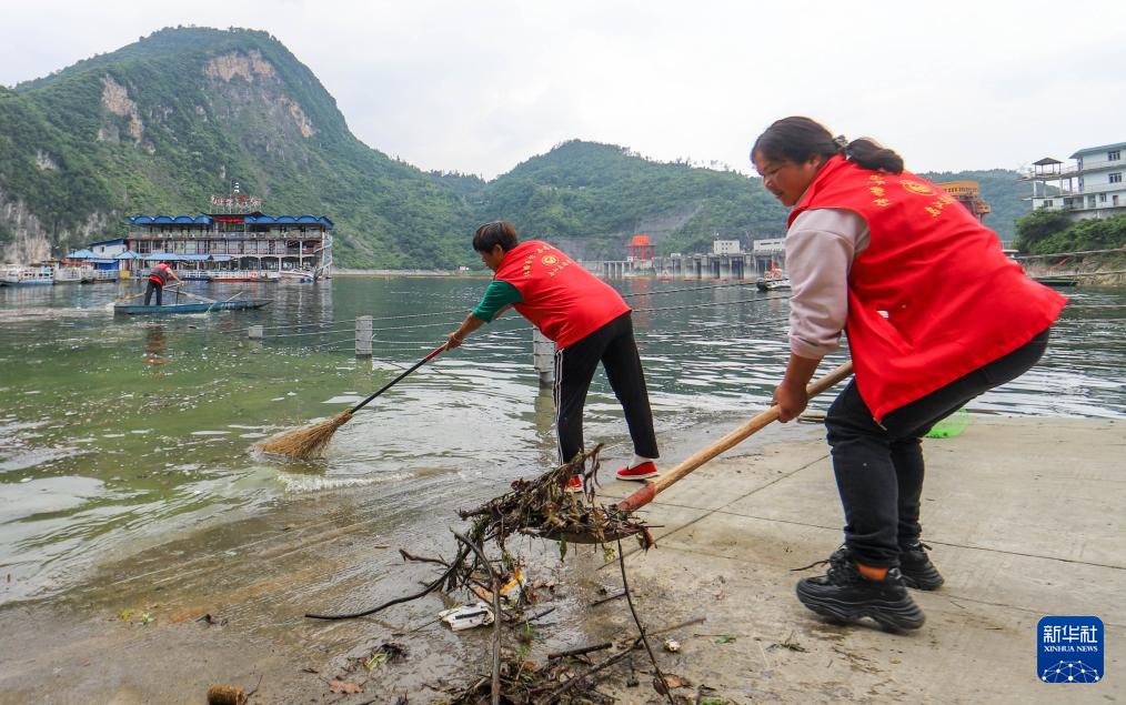 6月3日,志愿者在乌江岸边清扫垃圾。