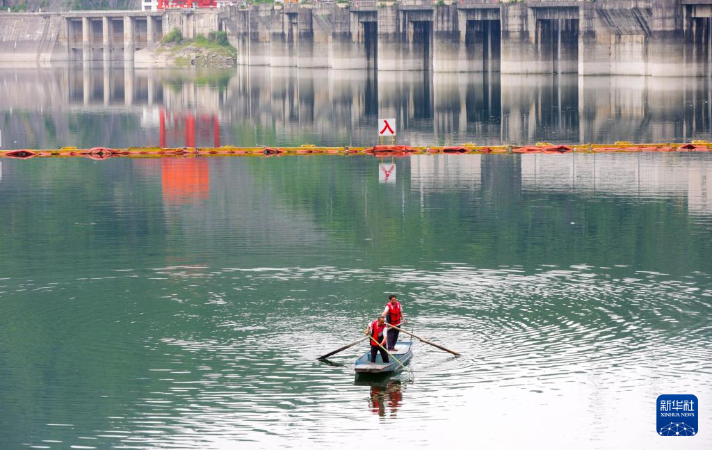 6月3日,李洪祥(左)和志愿者驾驶小船在乌江上打捞漂浮物。