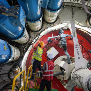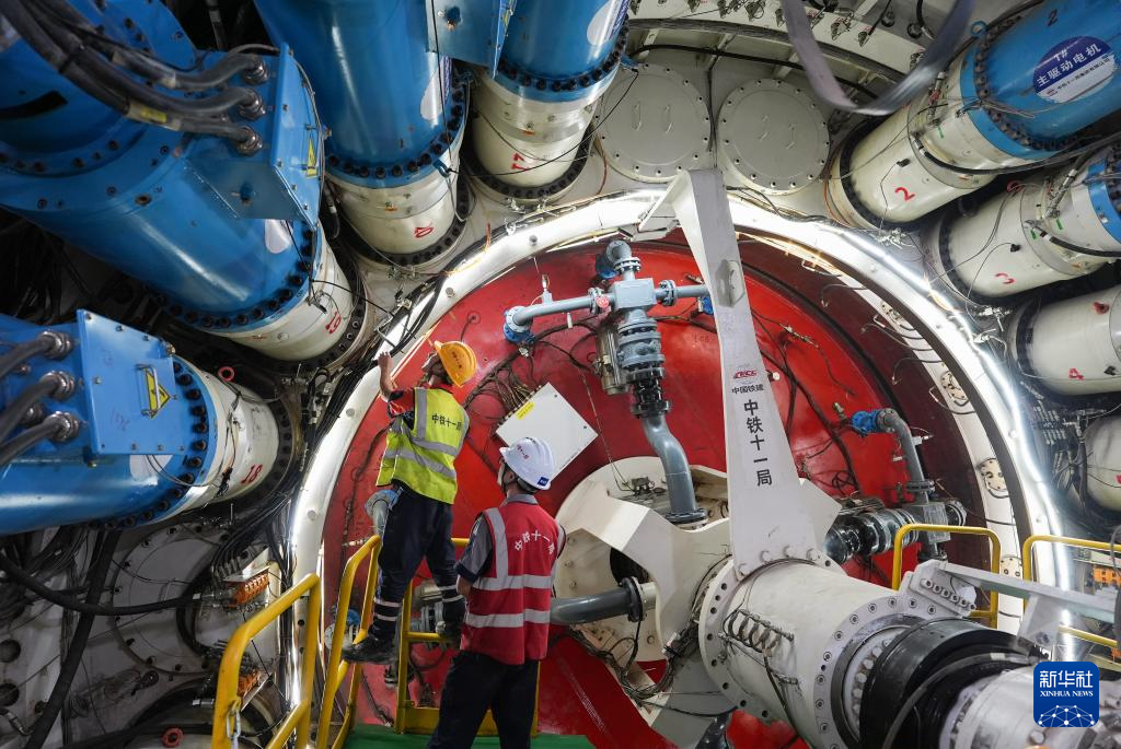 6月5日,中铁十一局技术人员在甬舟铁路金塘海底隧道“定海号”盾构机内关注设备运行情况。