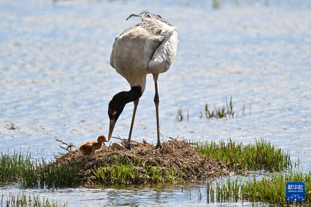 一对黑颈鹤在那曲市申扎县的湿地上照顾刚出壳的雏鸟,一只将其护在身下保持温暖,另一只则在旁保持警戒(6月4日摄)。