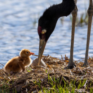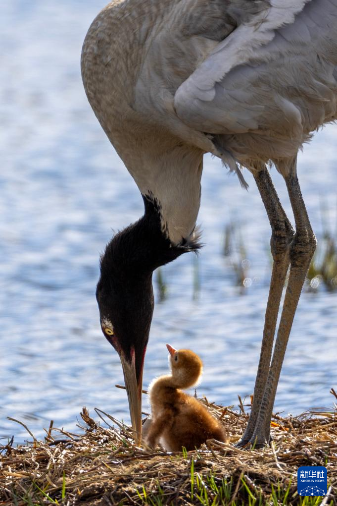 6月4日,在西藏那曲市申扎县,一只黑颈鹤查看刚出生雏鸟的情况。