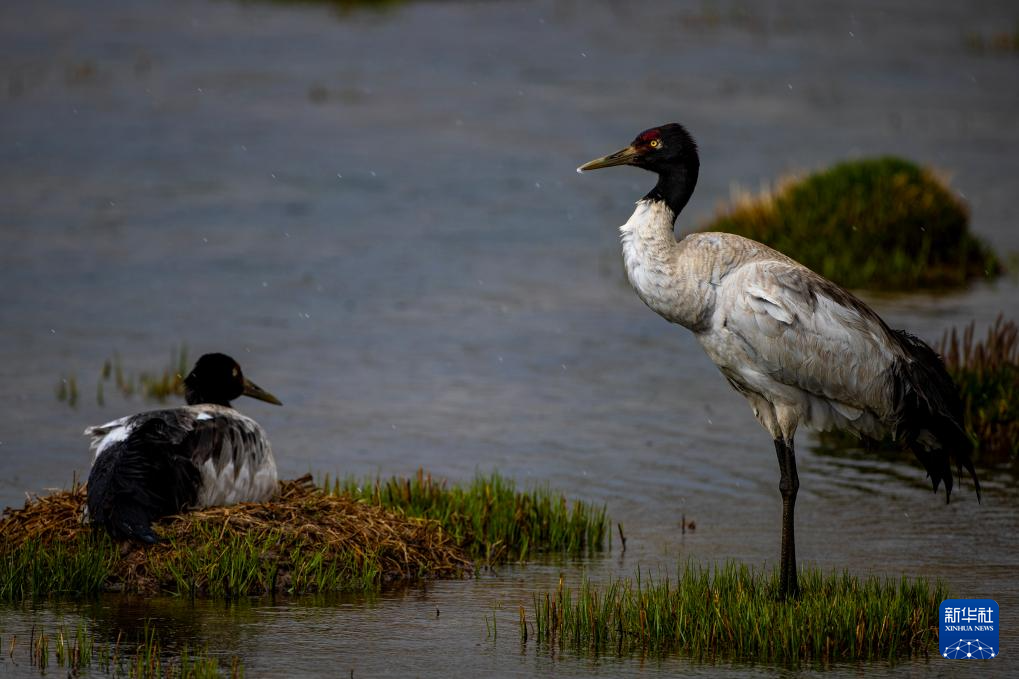 一对黑颈鹤在那曲市申扎县的湿地上“换班”照顾刚出壳的雏鸟(6月4日摄)。