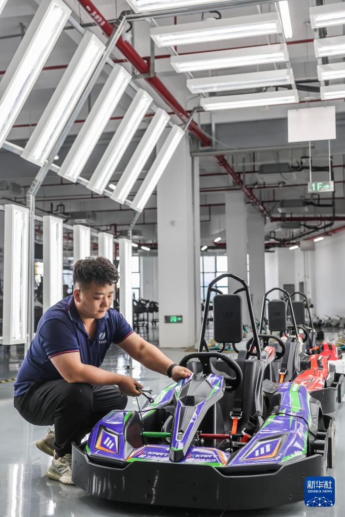6月5日,在位于金华市金东区金义新区的金华市壹维科技有限公司车间,工人在装配一批出口的电动卡丁车。该公司专注高端卡丁车、越野休闲车及周边产品,是集研发、生产、销售于一体的国家高新技术企业。