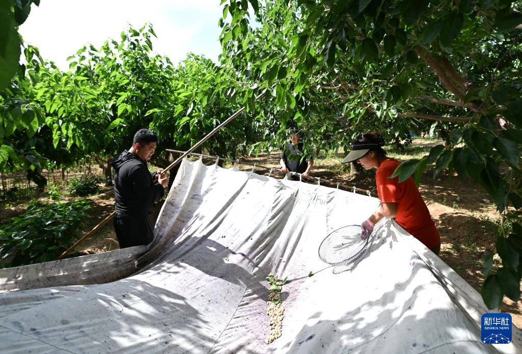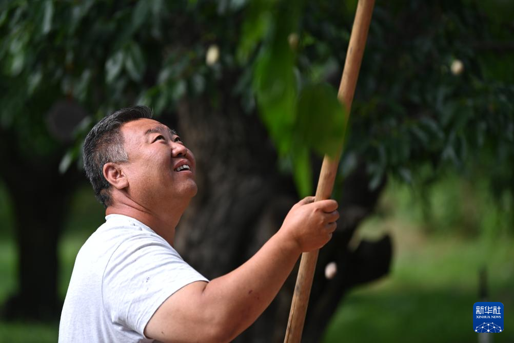 天津市蓟州区别山镇的农户手拿打棍收获桑葚(6月6日摄)。