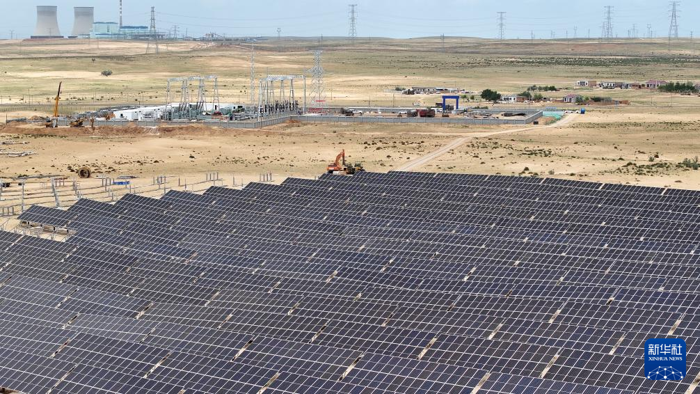 6月8日拍摄的宁国运灵武100万千瓦光伏复合项目330千伏输变电工程线路起点——灵武330千伏升压站(无人机照片)。