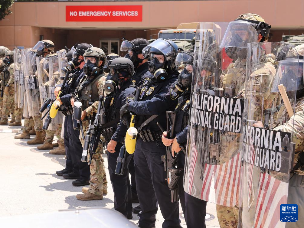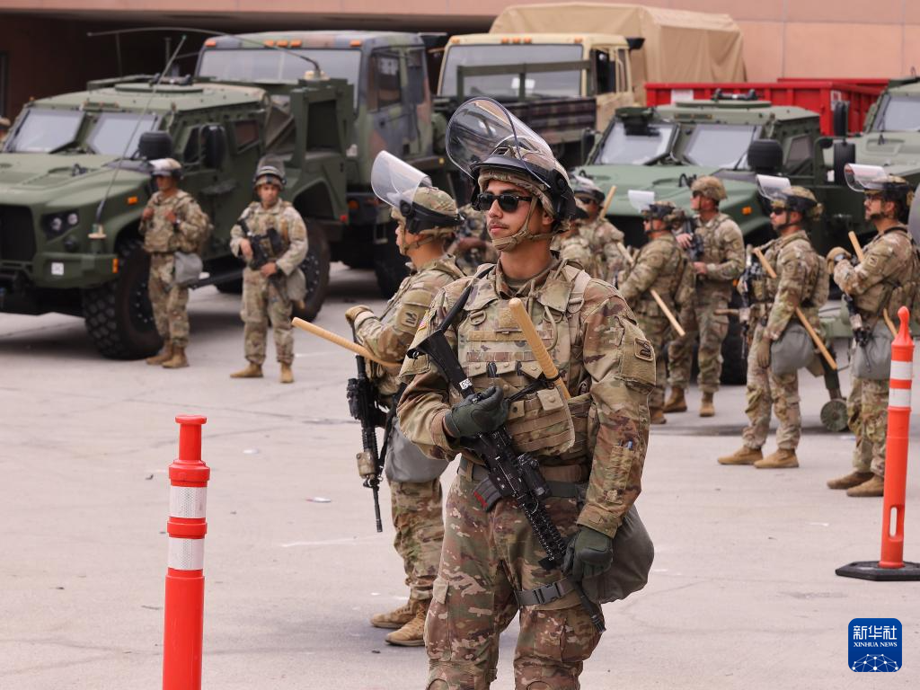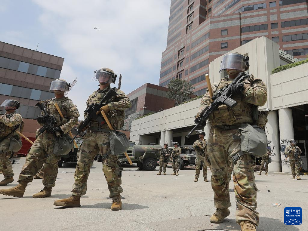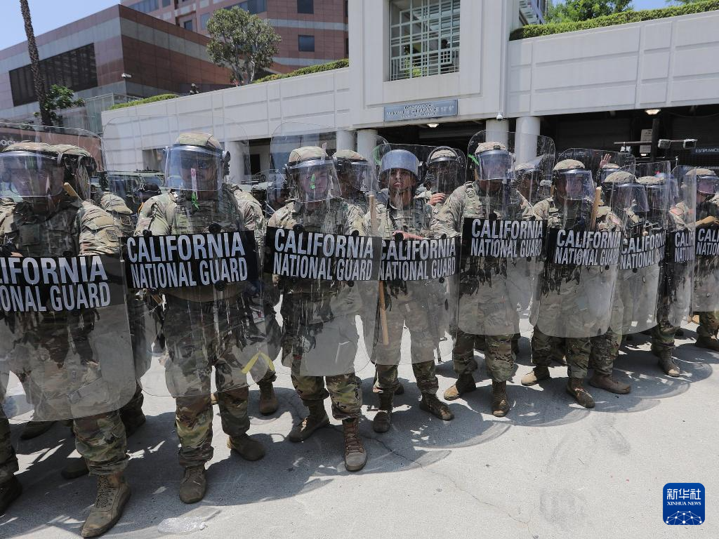 6月8日,国民警卫队人员在美国加利福尼亚州洛杉矶市中心的联邦执法机构门前警戒。