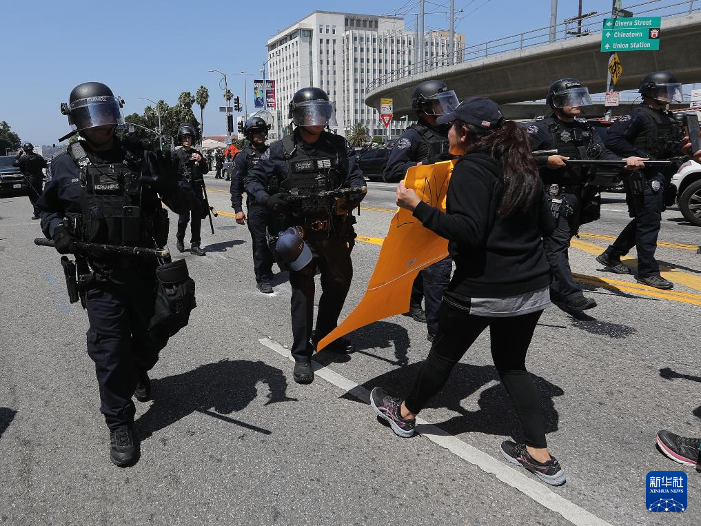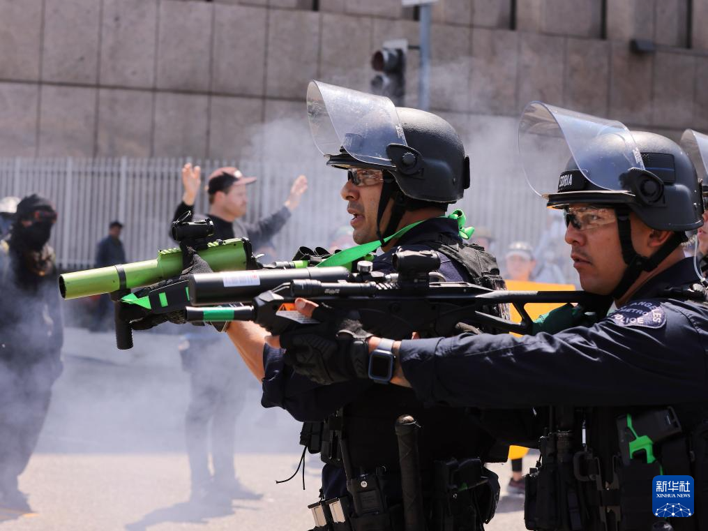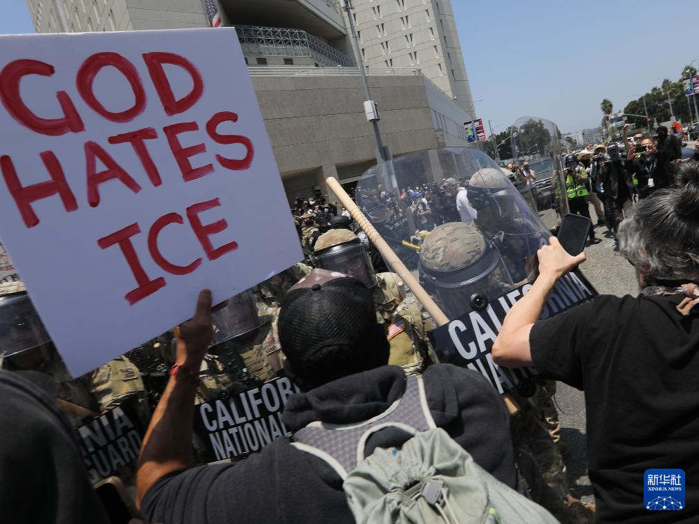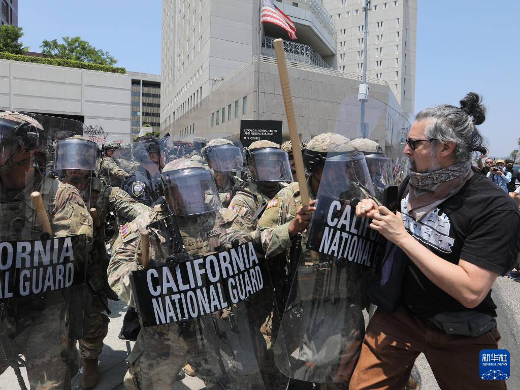 当地时间8日中午,在美国加利福尼亚州洛杉矶市中心联邦执法机构门前的抗议者与部署在该地的国民警卫队人员发生冲突。
