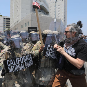 6月8日,在美国加利福尼亚州洛杉矶市中心的联邦执法机构门前,抗议者与国民警卫队人员发生冲突。