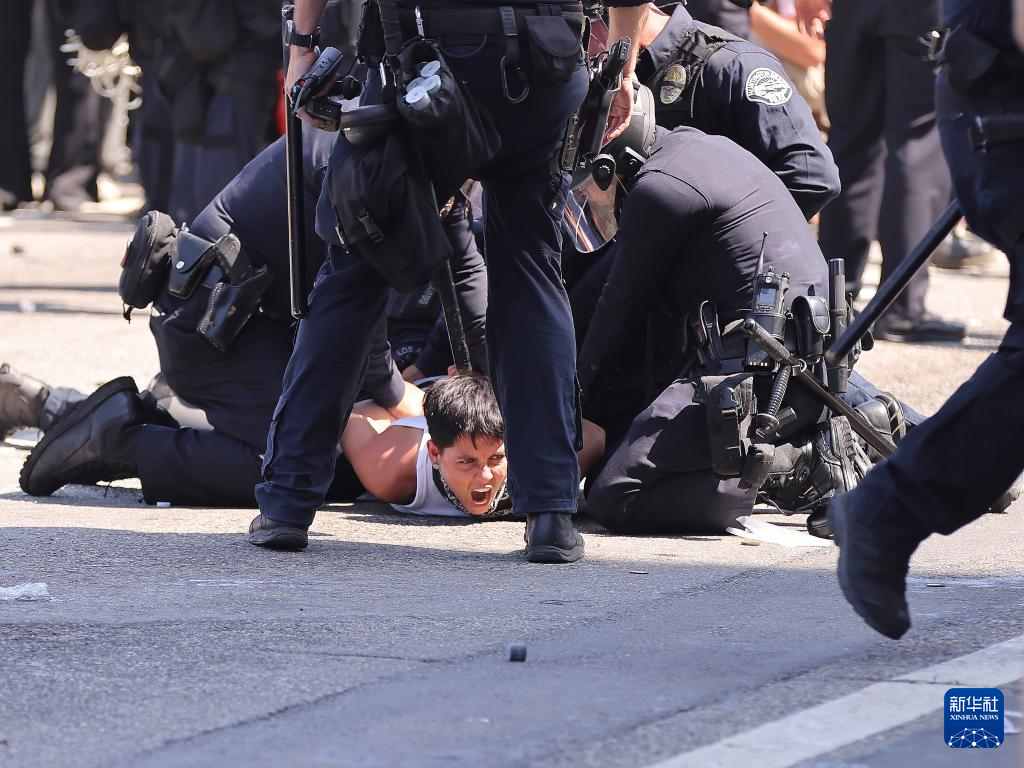 6月8日,在美国加利福尼亚州洛杉矶市中心的联邦执法机构门前,一名抗议者被警察控制。