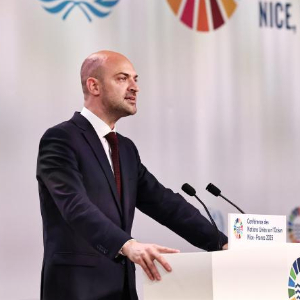 6月10日,在法国南部城市尼斯,法国外长巴罗在第三届联合国海洋大会一般性辩论上发言。