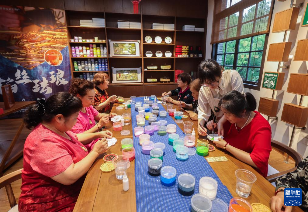 6月10日,游客在子城欢喜书店“江湖书局”民艺巷沉浸式体验传统掐丝珐琅技艺。