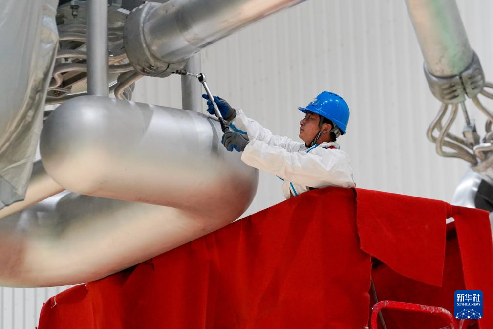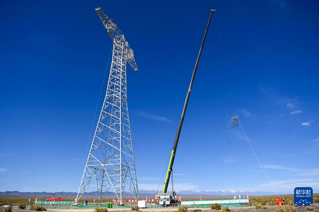 在新疆哈密市伊吾县,哈密—重庆±800千伏特高压直流输电工程施工现场,工程建设人员进行铁塔组立作业(2024年7月12日摄)。