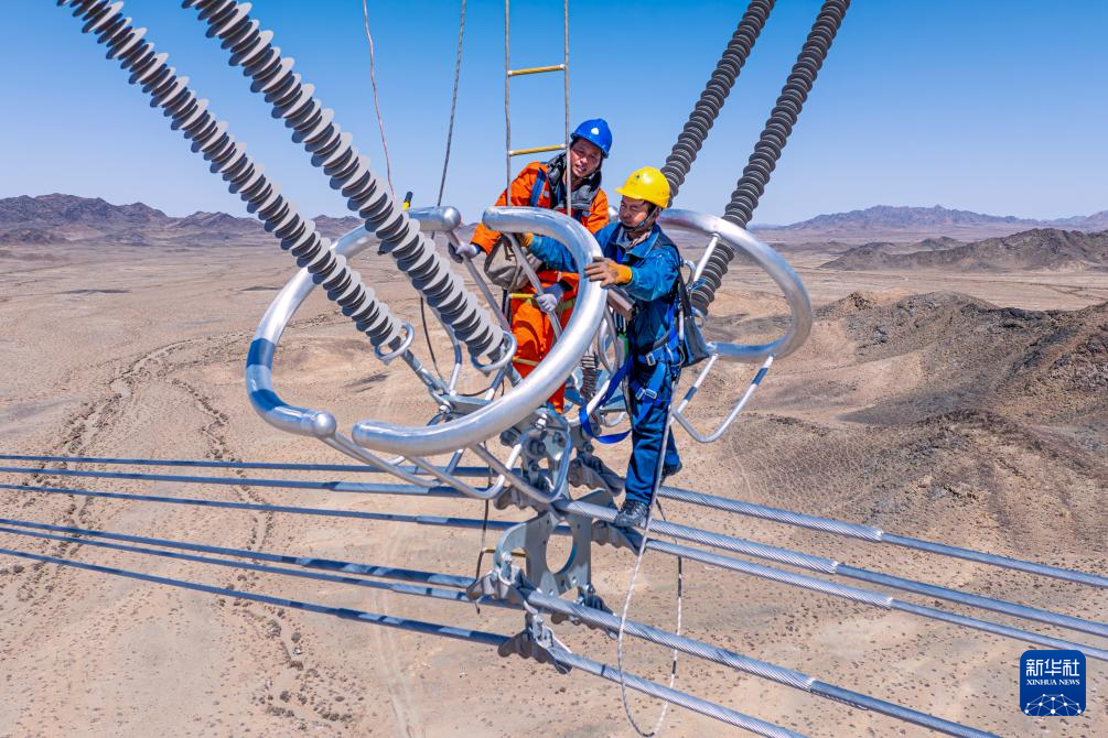 在新疆哈密市,电力员工在哈密—重庆±800千伏特高压直流输电线路上对均压环进行检查验收(4月13日摄,无人机照片)。