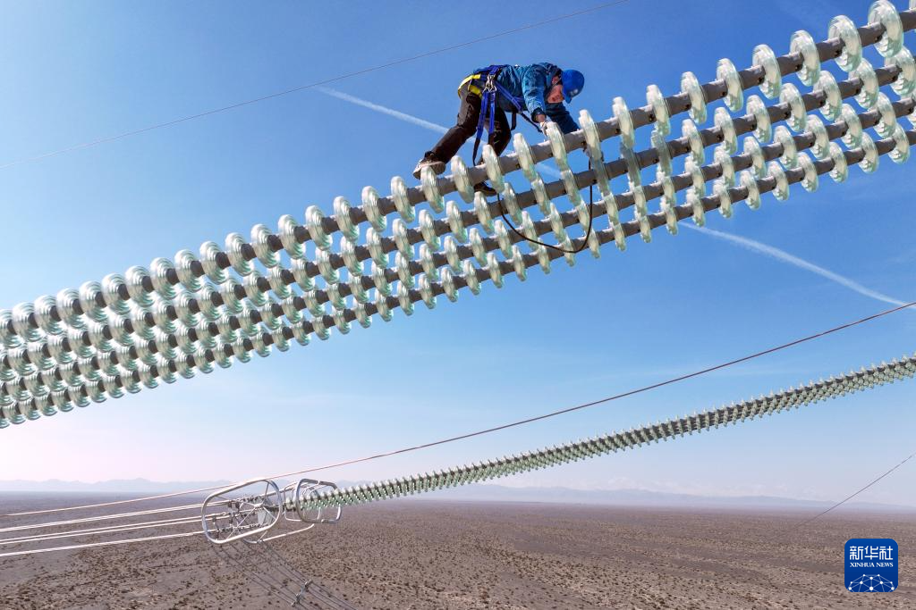 在新疆哈密市,电力员工对哈密—重庆±800千伏特高压直流输电工程进行走线检查(4月8日摄,无人机照片)。