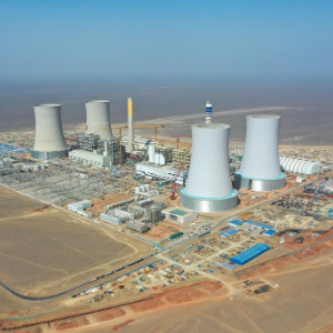 这是在新疆哈密市巴里坤哈萨克自治县拍摄的哈密—重庆±800千伏特高压直流输电工程配套火电厂(3月22日摄,无人机照片)。
