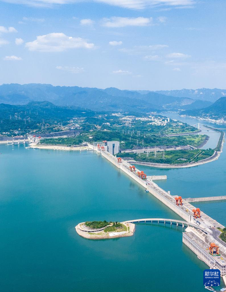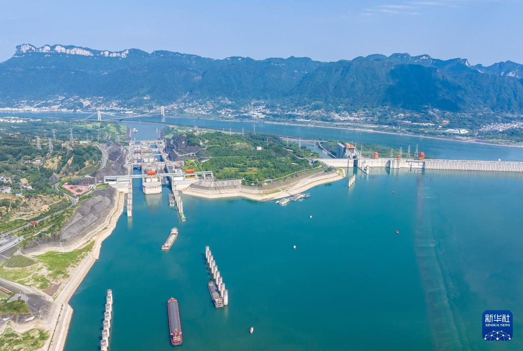 6月10日,船舶有序行驶在三峡大坝上游湖北省宜昌市秭归县水域(无人机照片)。
