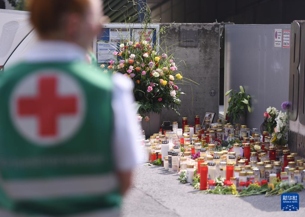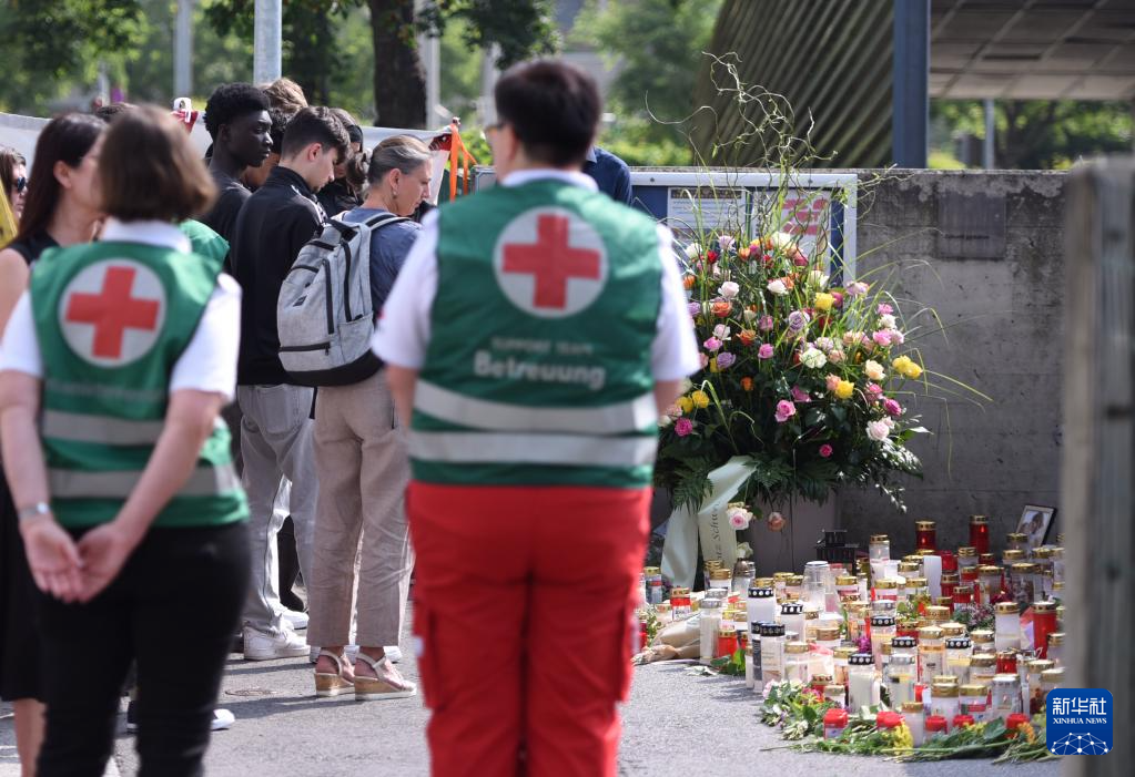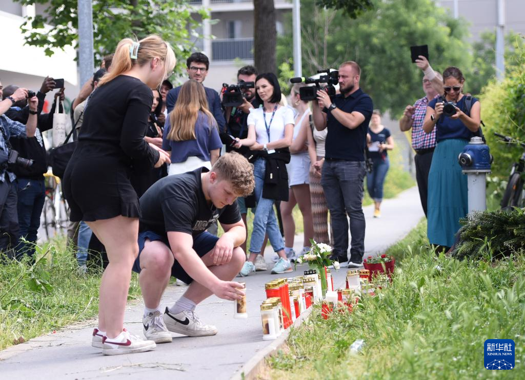 这是6月11日在奥地利格拉茨发生枪击事件的学校外拍摄的悼念活动现场。