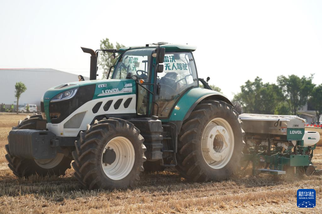 活动现场展示的无人驾驶拖拉机和精播机(6月12日摄)。